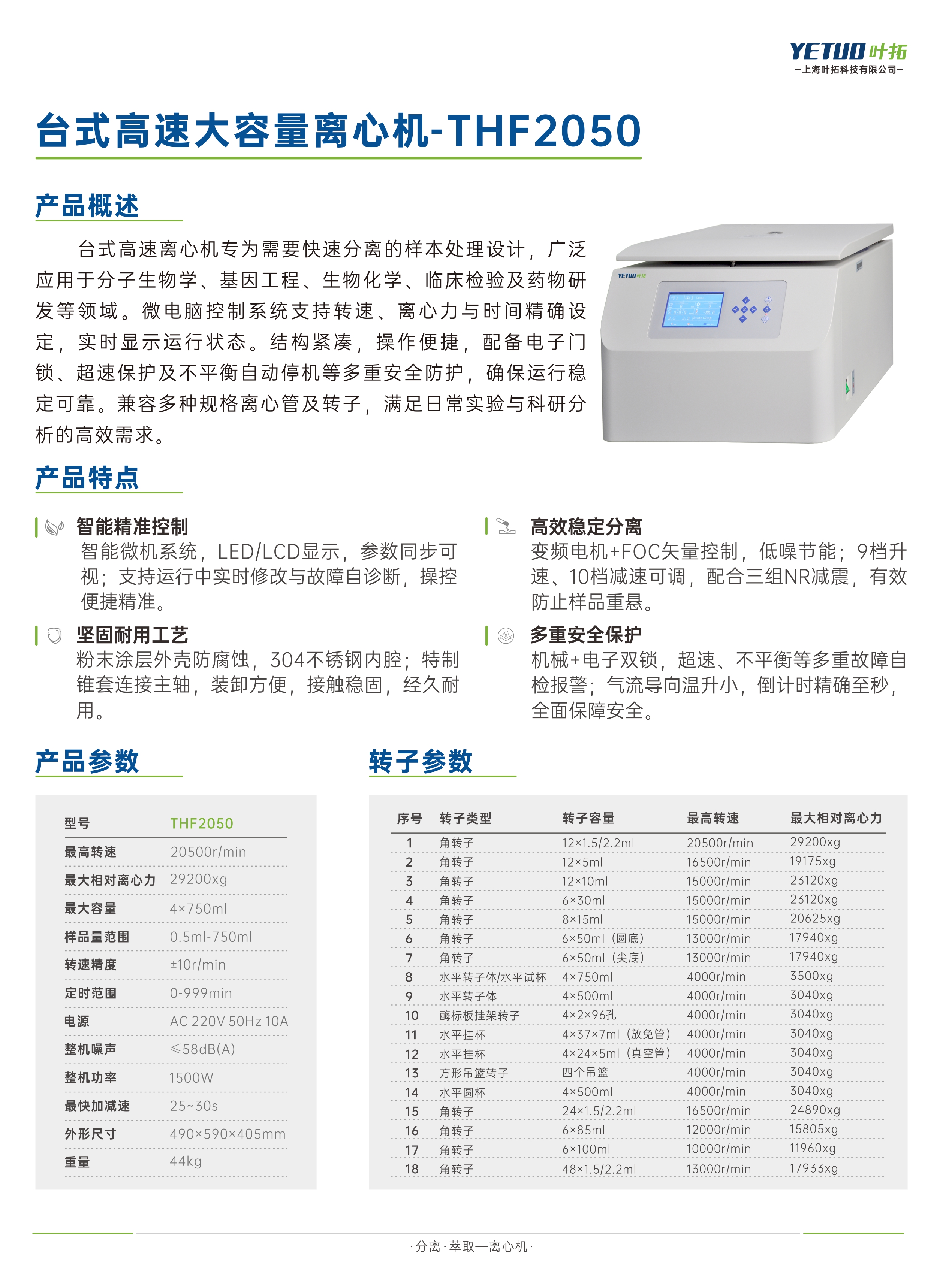 葉拓 THF2050 臺式高速大容量離心機詳細參數