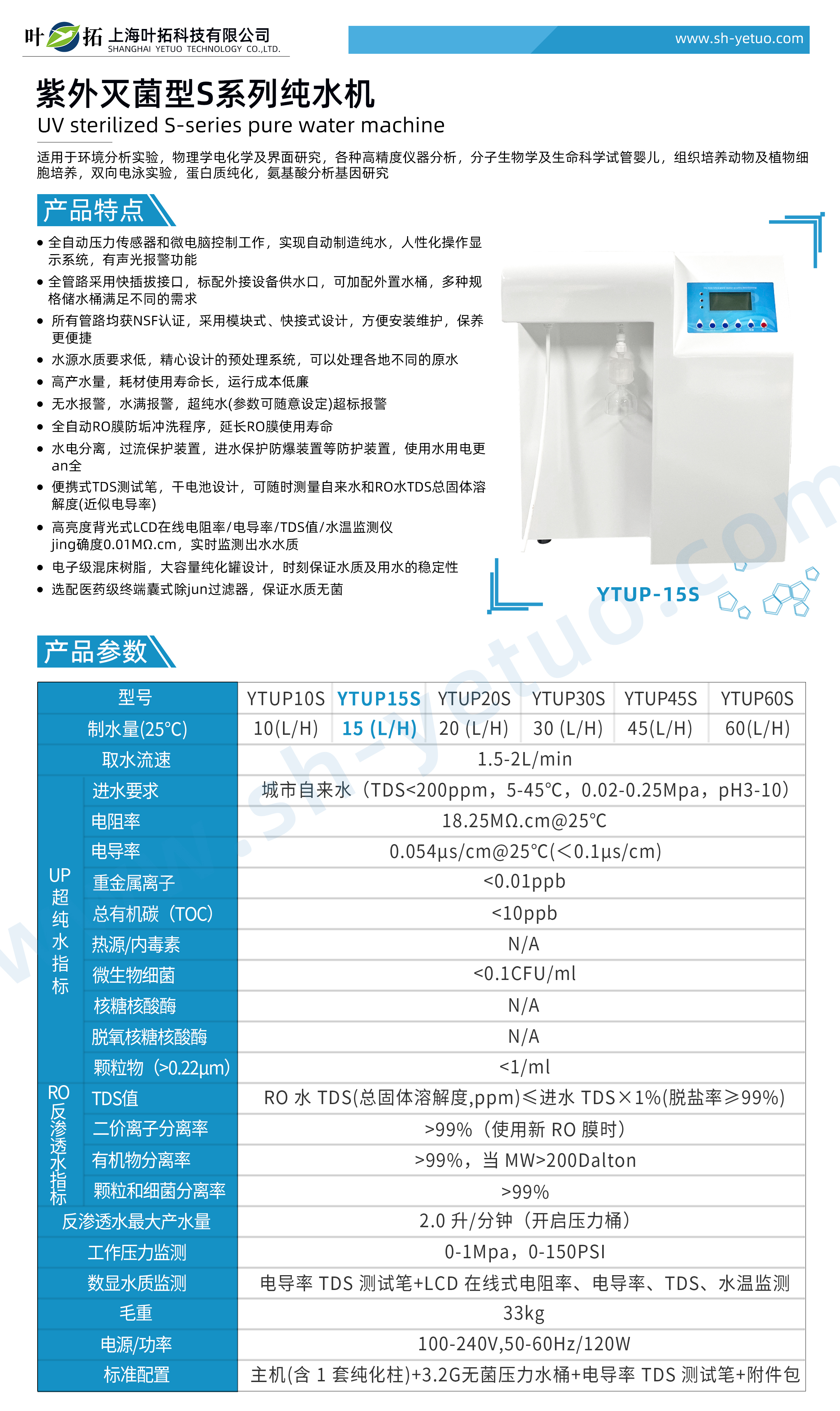 葉拓 YTUP15S 標準型超純水機詳細參數