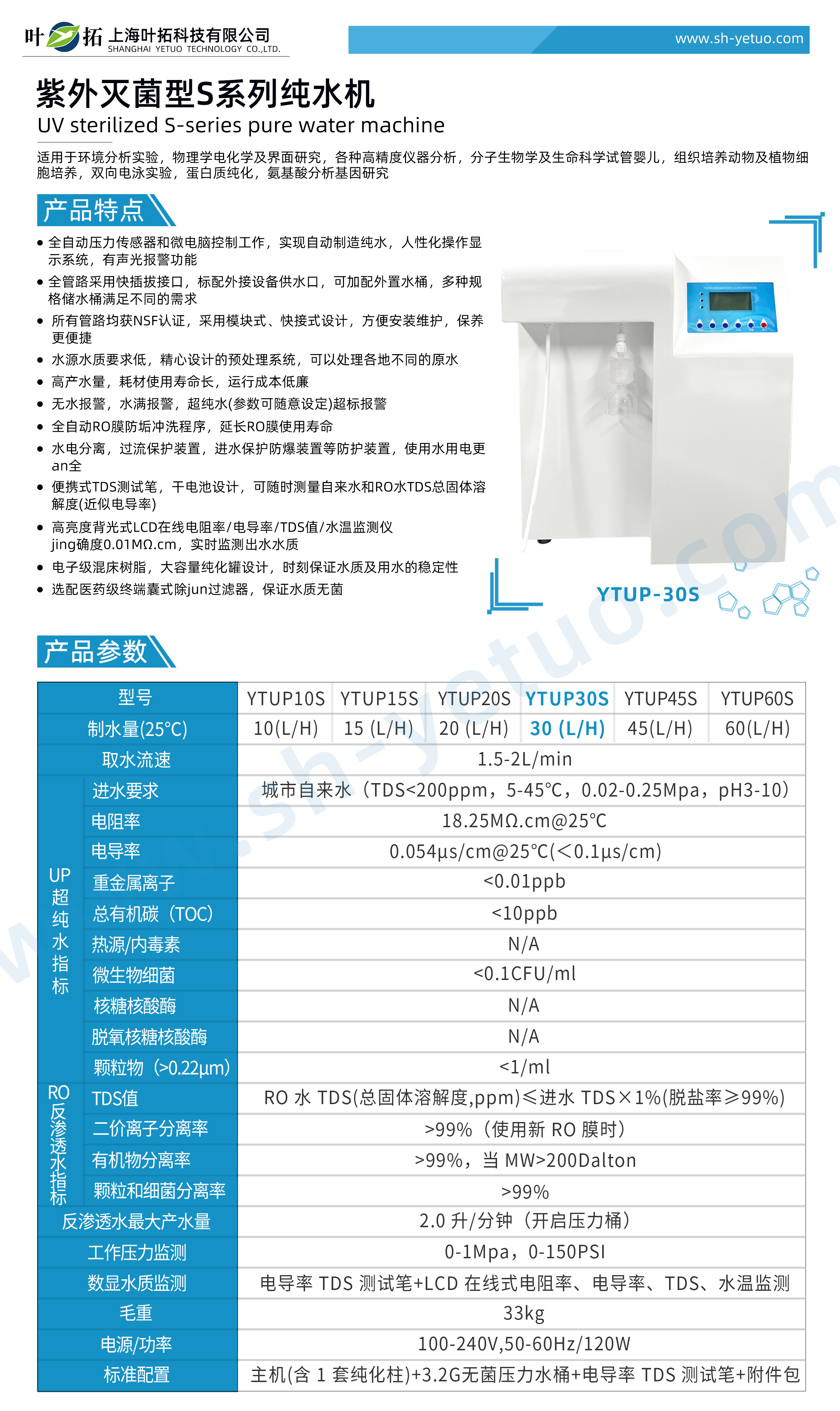 葉拓 YTUP30S 標準型超純水機詳細參數
