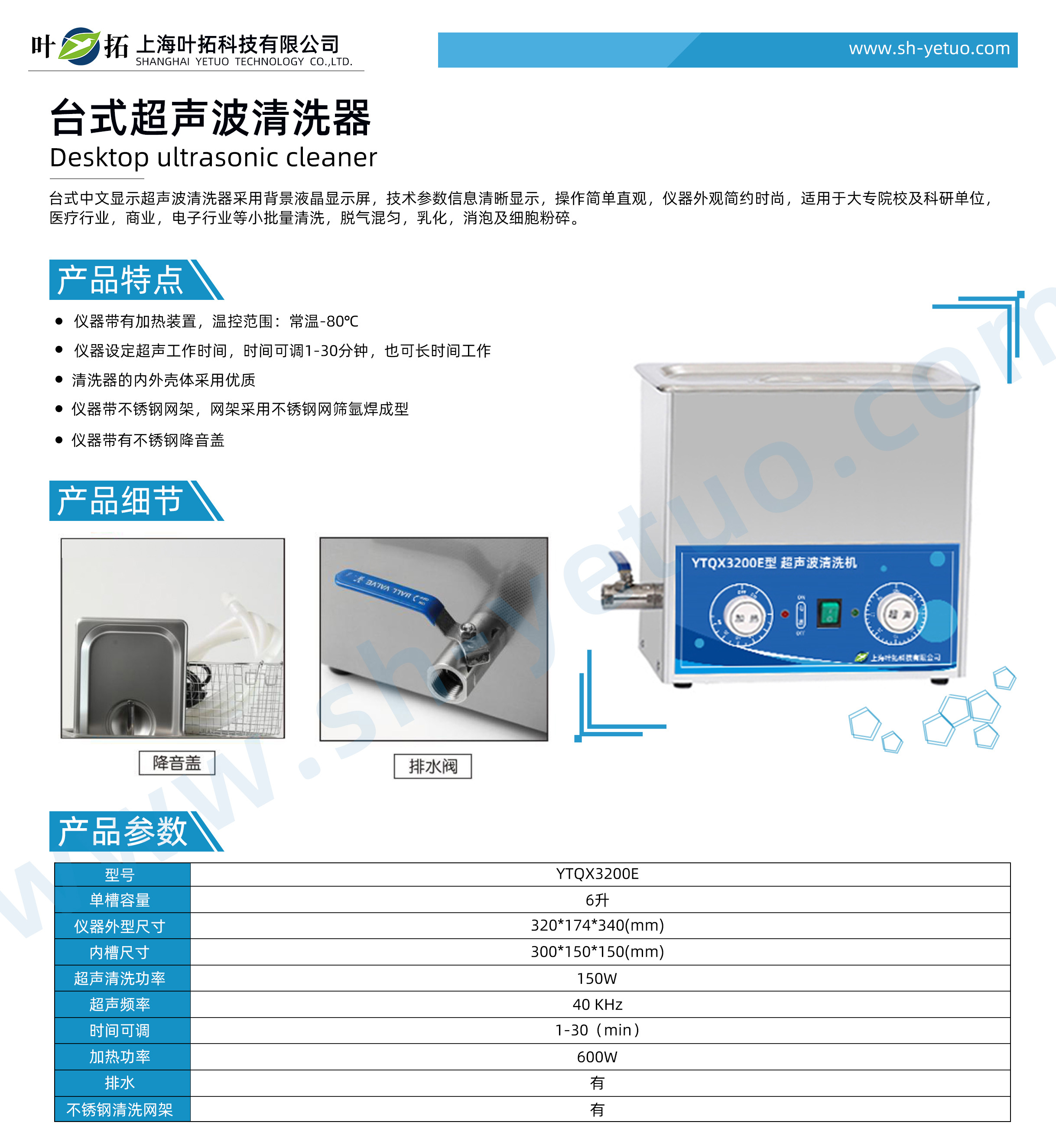 葉拓 YTQX3200E 臺式超聲波清洗機詳細參數
